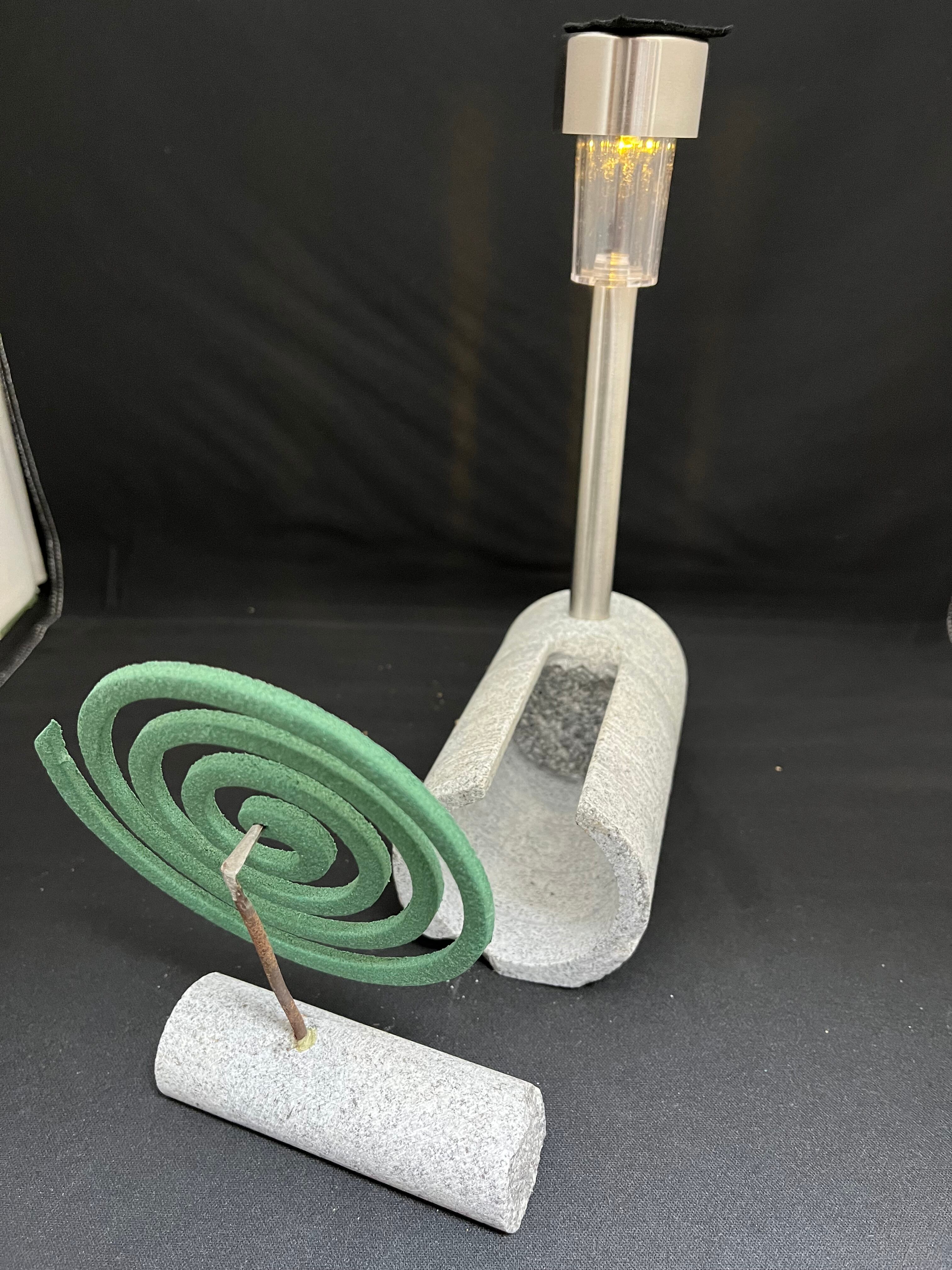 石でできた蚊取り線香立てとして使える灯り。夜になると、ソーラーライトが灯りを灯し、庭先や玄関先を暖かく照らします。夜のバルコニーや庭でのリラックスタイムをサポートするアイテムです。